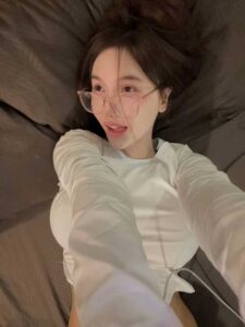 ในห้องส่วนตัว เสื้อแขนยาว สีขาว ใส่แว่นกรอบโตเป็นเด็กเนิร์ด น่ารักมาก ปิดท้ายเซ็ตนี้ด้วยการเน้น หน้าอก ให้เห็นกับเสื้อที่รัดรูปเข้ามาชัดไปอีก